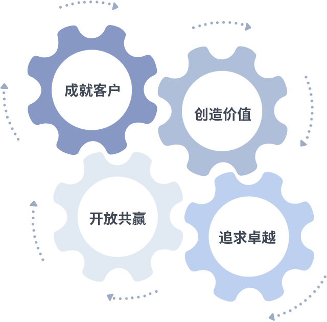 成就客户是一切决策的出发点,,,,创造价值是衡量所有工作的标准,,,,追求卓越是我们做事做人的态度,,,,开放共赢是我们的格局也是最终的结果。。。价值观的齿轮环环相扣,,推动着组织里的每个人不断向前。。。